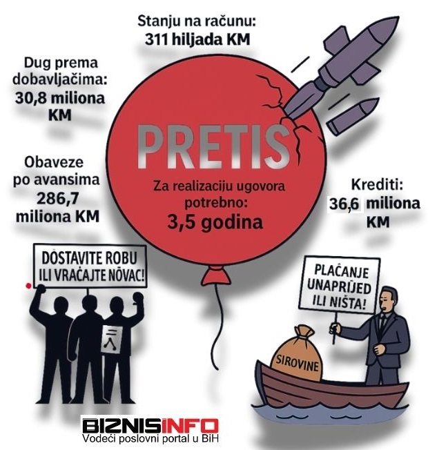 – Ukupne obaveze kompanije iznose oko 368,6 miliona KM, od čega je približno 78 posto vezano za primljene avanse od kupaca (286,7 miliona KM). Ove obaveze predstavljaju ugovornu odgovornost za isporuku robe i usluga, čiji kapacitet pokrivanja je u ovom trenutku neizvjestan. Likvidna sredstva su izrazito niska (oko 1,06 milion KM), dok potraživanja iznose 52,3 miliona KM, ali nisu naplaćena – navedeno je, između ostalog, u izvještaju Odbora za reviziju koji je dostavljen Nadzornom odboru Pretisa.
