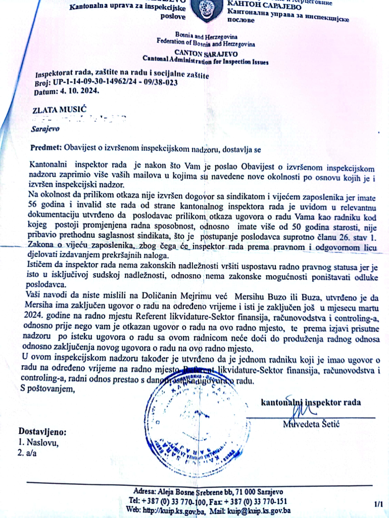 Takva odluka iz inspekcijskog nalaza vidljivo primljena je na Zlatinoj adresi 12.8.2024. godine. Iako je i dalje na bolničkom liječenju ostavljen joj je rok od 8 dana za potpisivanje novog ugovora o radu, a kako isti nije mogla prihvatiti kao hospitalizirana pacijentica započeo je otkazni rok od 14 dana što je već 3. septembra značilo odjavu zaposlenice sa radnog mjesta.