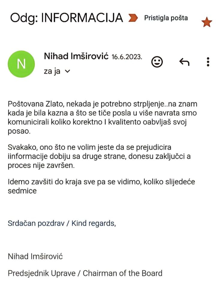 Zlata Musić nije od onih koji šute, obraćala se tadašnjim direktorima kompanije, koji su se u tom periodu mijenjali jer se ovaj trgovački lanac kupovao i prodavao. Pisala je i tadašnjem direktoru Uprave društva Konzum Nihadu Imširoviću, koji joj jeodgovorio da nema zamjerke na njeno obavljanje povjerenog joj posla.