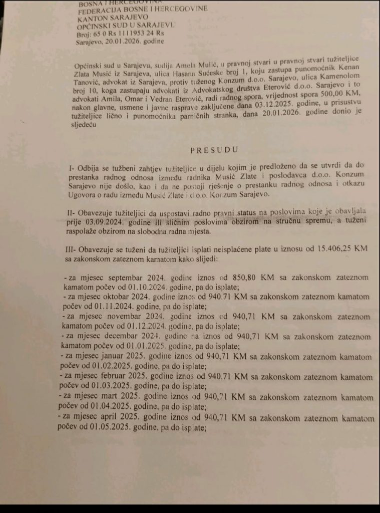 Povratak na posao, te isplatu svih plaća s kamatama do povratka na posao – tako je odlučio Općinski sud u Sarajevu u slučaju Zlate Musić, radnice Konzuma iz Sarajeva.